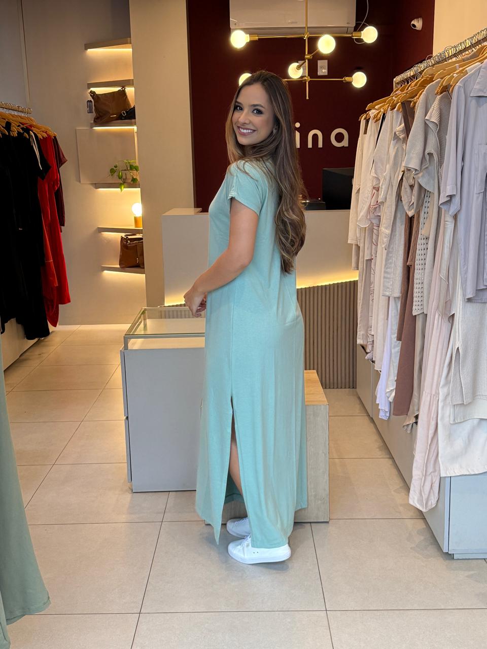 Vestido longo, de manguinha.
