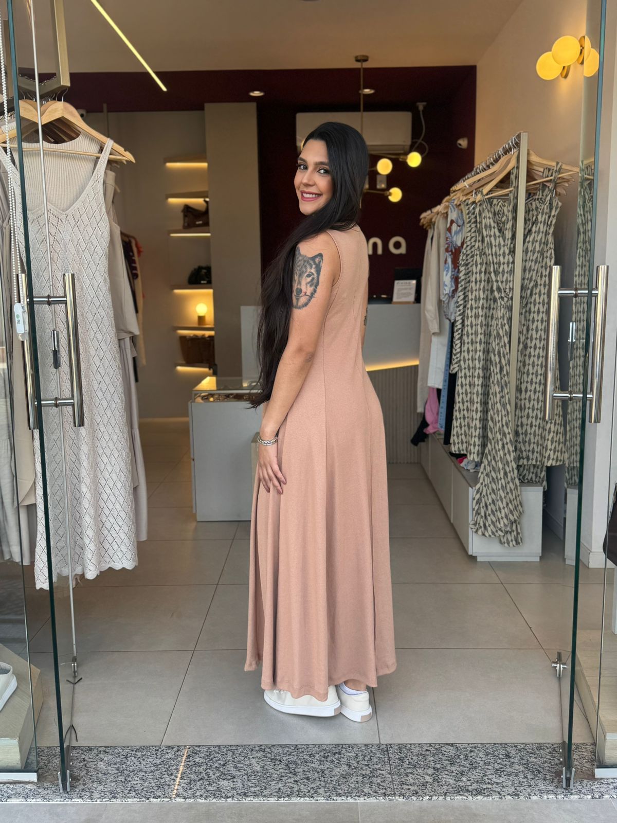 Esse vestido é um modelo longo com um design elegante e fluido.